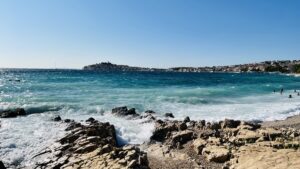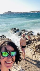 von hier aus hat man wirklich eine netten (foto)blick auf die city Primošten, aber auch linker hand auf türkis blaues meer und wellen, die gerade vom wind an land gepeitscht werden. so sind wir dann spontan runter zu Beach Mara 2 und es hat nicht lange gedauert, bis wir mittendrin statt nur dabei sein wollten – inkl. nem feinem schlückchen salzwasser ;-).