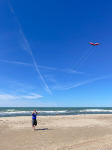 was an diesem sonnigen tag sein musste, auch weil das wetter heute etwas weniger windig war wie an den vergangenen tagen: den vorgestern in lökken gekaufen drachen steigen lassen.