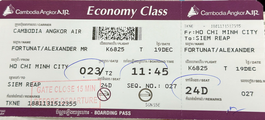 Sehr pünktlich um 6:15 Uhr geht es los zum Bus Terminal nach Ben Tre. Der Bus bringt mich dann nach Saigon. Dort angekommen an der Bus – Station bestelle ich mir ein Grab-Taxi zum Flughafen. Um 12:35 Uhr geht mein Flug nach Kambodscha, genauer gesagt nach Siem Reap.