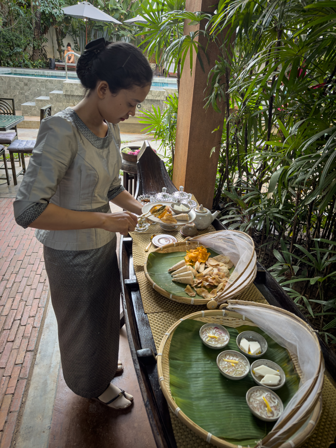 Nach einer Dusche, zwingt mich der Hunger aber trotzdem noch einmal, das Hotel zu verlassen. Ich finde interessantes Street food zum Essen direkt am Siem Reap River, wo mir mein Guide Cal Thou den Tipp dazu gegeben hat.