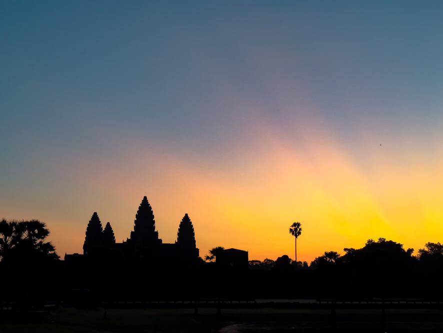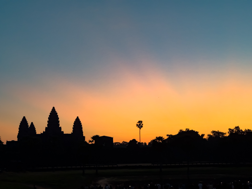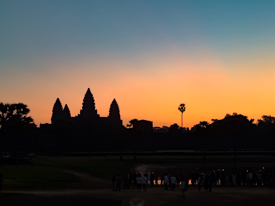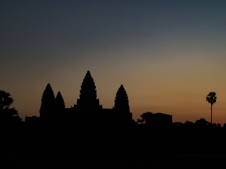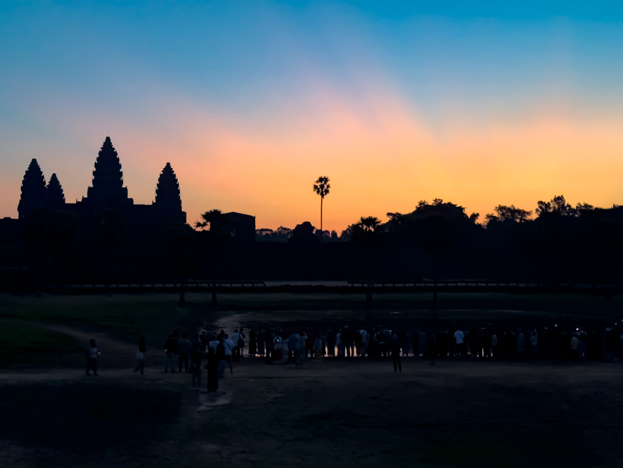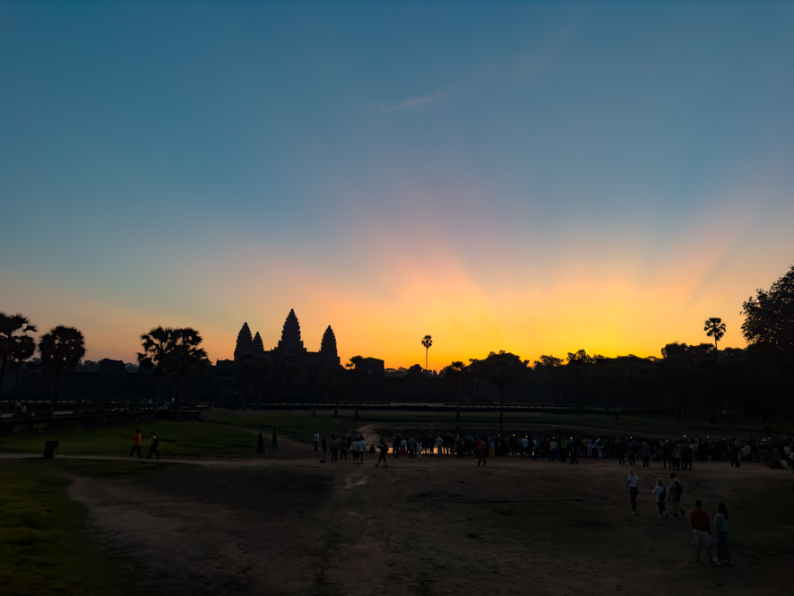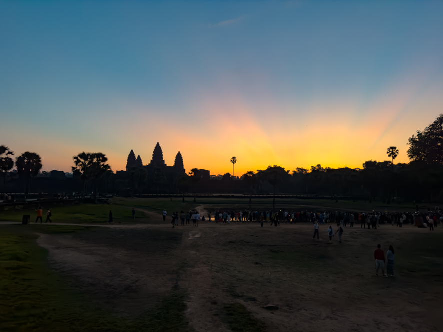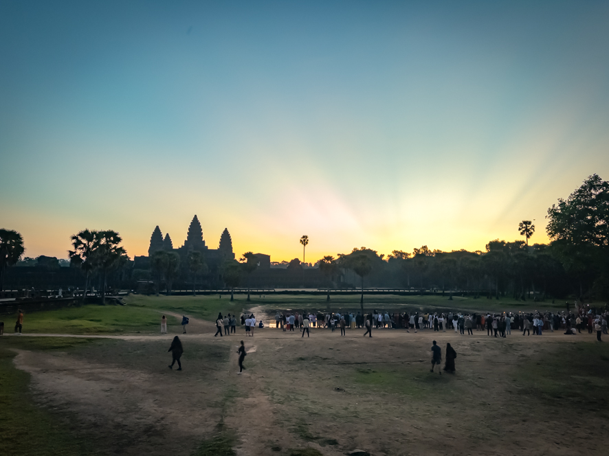 Der Sonnenaufgang im Hintergrund mit den Türmen von Angkor wat im Vordergrund ist eine beeindruckende Kulisse und so mache ich so viele Fotos, bis der Speicher meines iPhones voll ist.