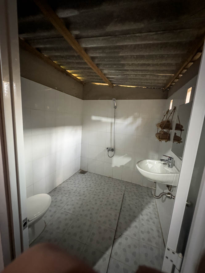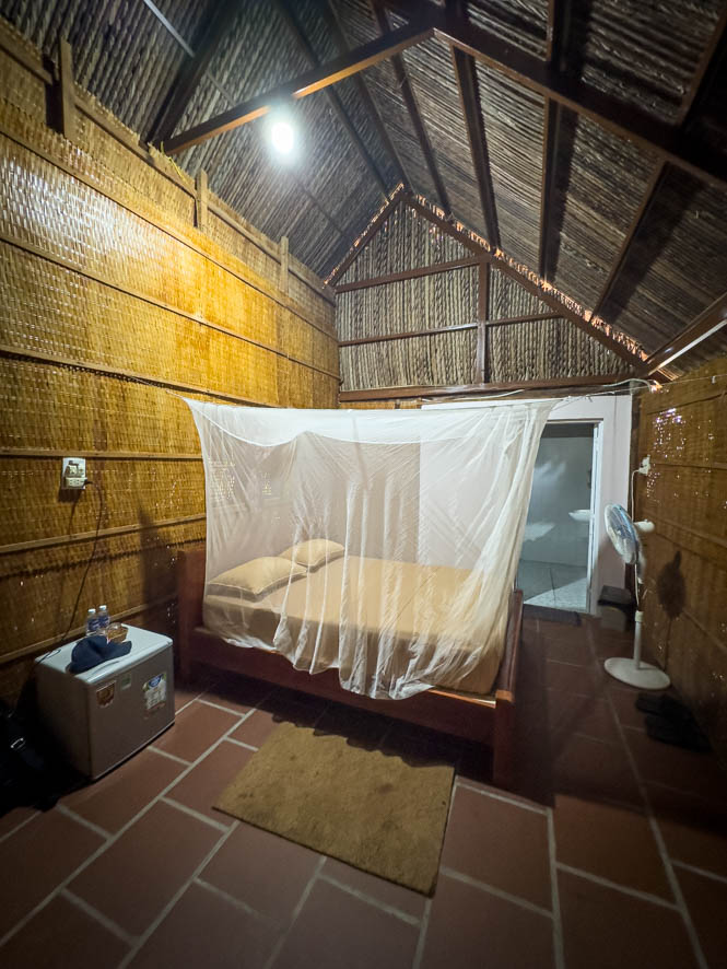 Wie gewohnt bestelle ich am Busbahnhof in Ben Tre angekommen ein Grab – Taxi welches mich zur Unterkunft bringen soll. Doch der Fahrer hatte schon einige Probleme, das genaue Ziel zu finden, obwohl ich es eindeutig mittels Adresse bei der Bestellung angegeben habe. Nach einer gemeinsamen Suche auf Google Maps stellen wir fest, dass die Unterkunft nicht über eine Straße, sondern nur zu Fuß erreichbar war. Ich ahnte schon Schlimmes 🙀. Tatsächlich musste ich die letzten 400-600 m zur Unterkunft zu Fuß zurücklegen. Auf dem schmalen Weg wurde ich von allerlei Getier von Hunden, Katzen, Hühnern und natürlich einigen Insekten verfolgt. Nach circa 10 Minuten Fußmarsch war ich froh, ohne von einem Hund gebissen worden , an der Unterkunft angekommen zu sein. Es sah alles so aus, als wäre man mitten im Jungel. Auf der von Bäumen und Palmen begrenzten Fläche standen mehrere Hütten mit einer zentralen Art Versammlungshütte in der Mitte. Ich wurde sehr freundlich von einer jungen Vietnamesin begrüßt. Sie zeigte mir sogleich meine Unterkunft. Das war der nächste Schock für mich: es handelte sich um eine Holzhütte ohne Fenster. Im Inneren war die Hütte abgeteilt mit einem Sanitärbereich, der wiederum mit einem Wellblechdach 😧 abgedeckt war. In dem Raum befand sich ansonsten nur ein Bett mit Moskitonetz und ein Möbelstück aus Bambus, wo man vielleicht etwas aufhängen könnte, ähnlich einer Garderobe. Mittlerweile haben mich gefühlte 20 Moskitos 🤬 gestochen.