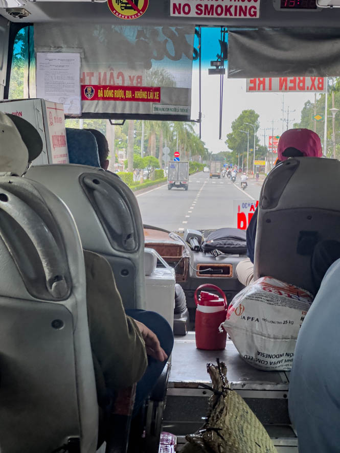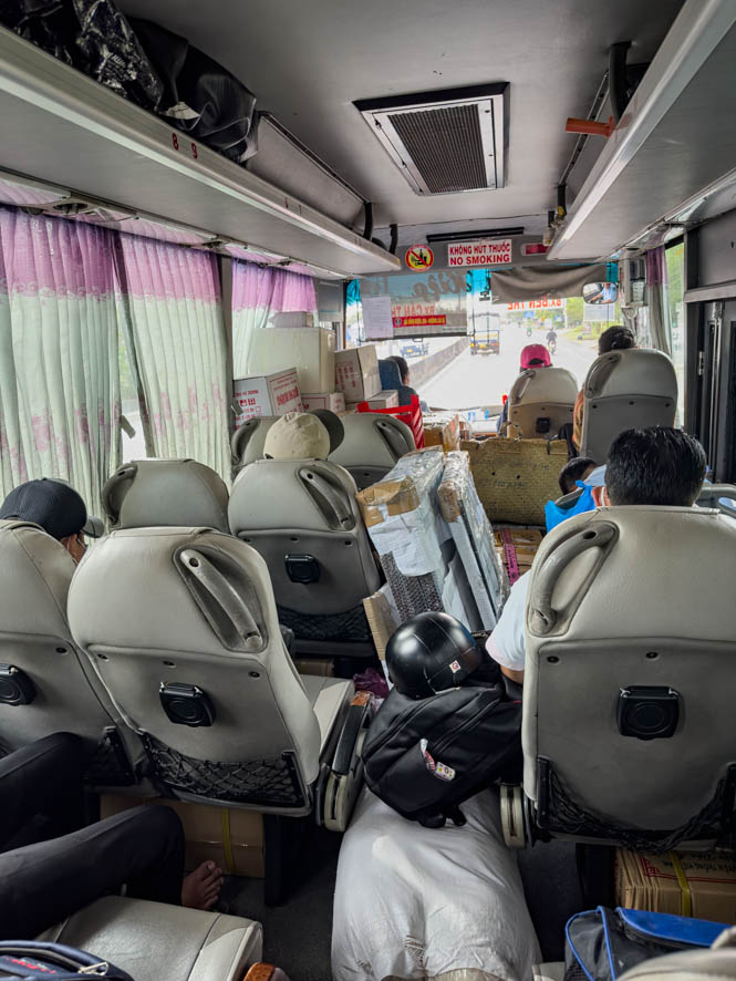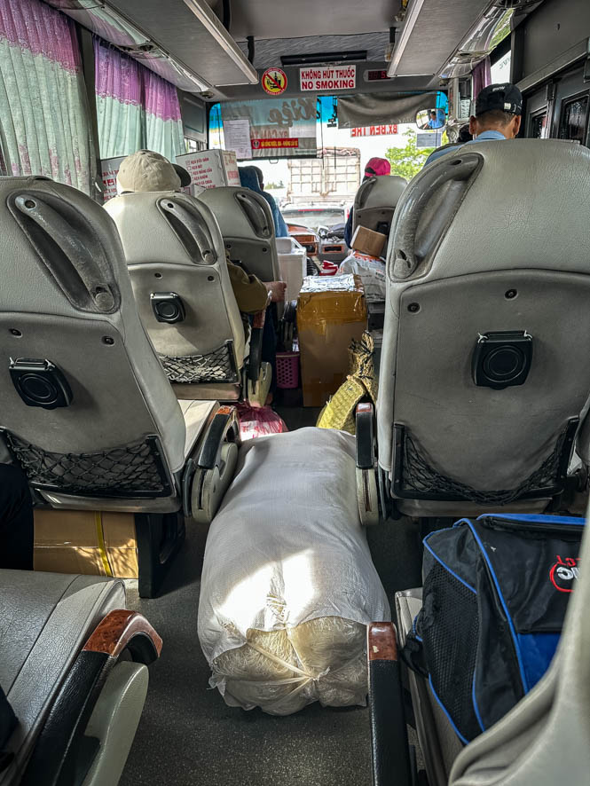 Dies ändert sich bald, denn kontinuierlich nehmen wir nicht nur Personen sondern auch Gebäck auf. Letztendlich hatte ich den Eindruck dass im Bus mehr Pakete und Säcke als Personen mitgefahren sind. Die transportierten Waren sind durch aus skurril: aus einer Tasche vorne höre ich eine Katze miauen, Säcke mit Reisnudeln, große Boxen umwickelt mit Isolierband und auf den Sitzen hinter mir höre ich ein Gackern 🐓 – ich bin mir aber nicht ganz sicher, ob es sich tatsächlich um ein Huhn handelt.