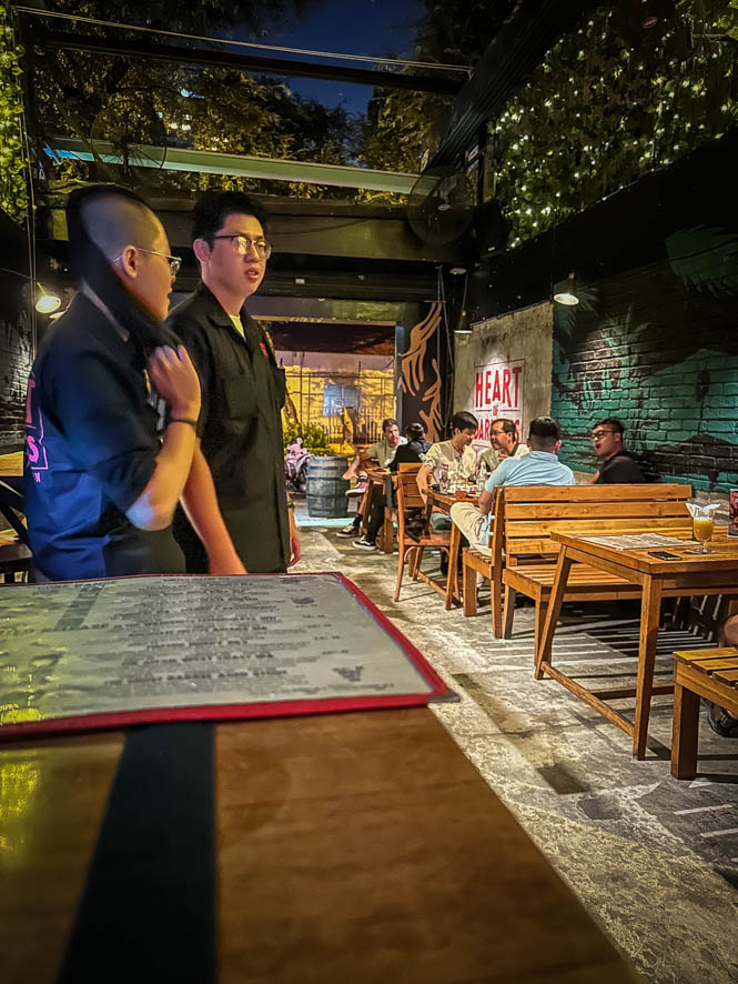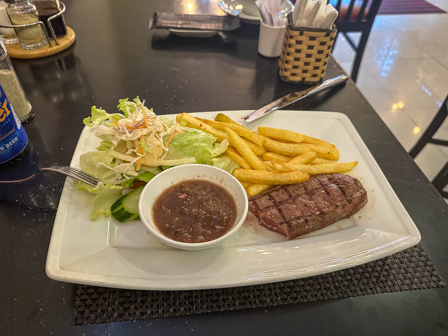 Letztendlich gelang es mir dann aber doch, einen coolen Laden zu finden. Dort wurde dann als Vorspeise eine Schwammerlsuppe serviert und als Hauptspeise gab es ein (kleines) Steak mit Rotwein Soße. Alles zwar nicht so, wie man es von zu Hause kennt, aber als Alternative zum täglichen Phò hat es mir trotzdem wunderbar geschmeckt. Sogar Pommes Frites gab es als Beilage. Mit einem Bier machte das ganze gerade einmal 7 Euro aus. Sowas kann man sich leisten!