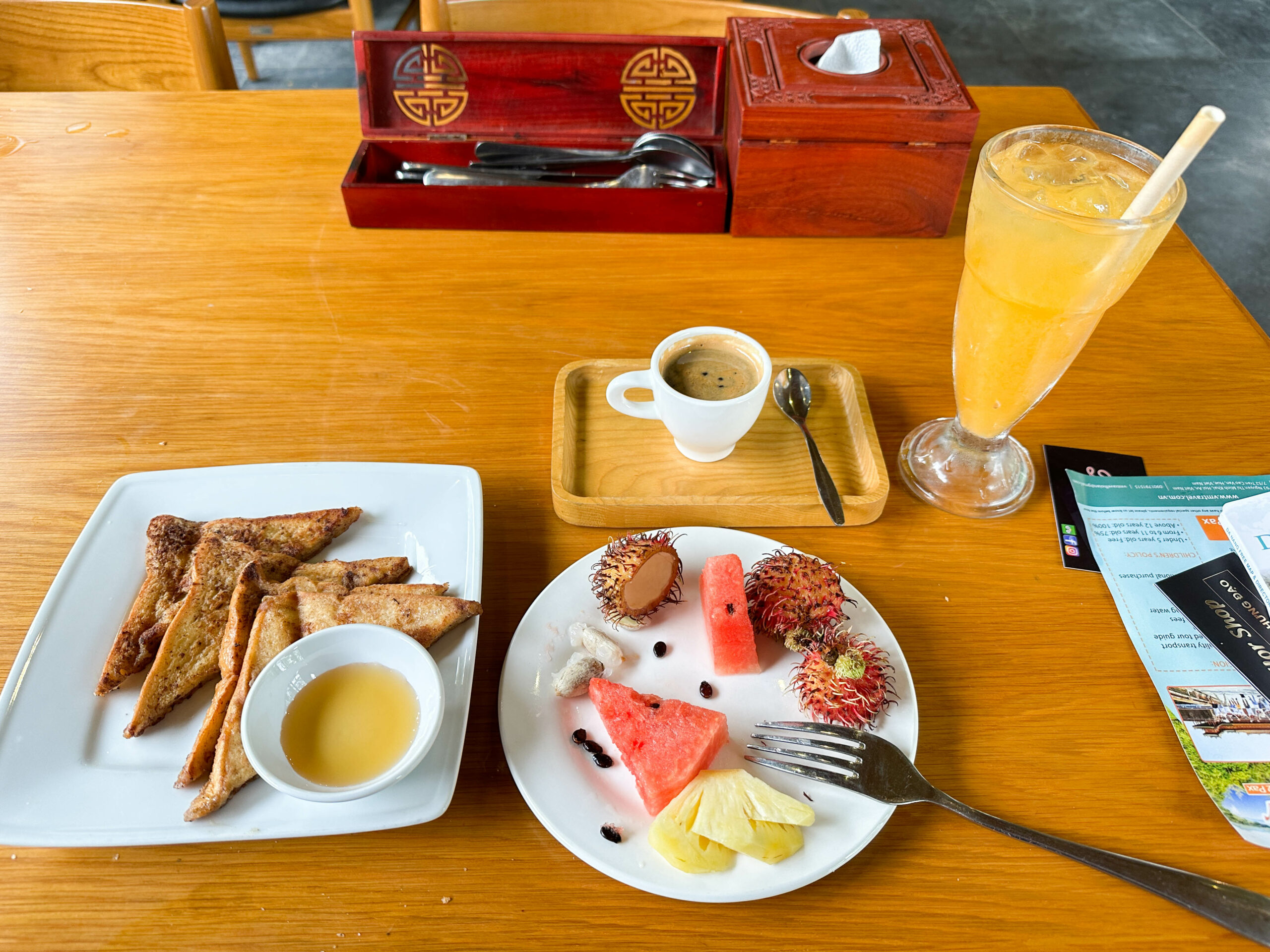 Um 7:00 Uhr sollte ich zu dem Tagesausflug in die alte Königsstadt Hue abgeholt werden. Womit ich nicht gerechnet hatte, dass ich der erste Passagier war, der von dem Reisebus aufgesammelt werden wird. So hatte ich keine Zeit, um noch ein kurzes Frühstück einzunehmen. Meine Unterkunftgeberrinnen hatten aber Mitleid mit mir, und bereiteten noch schnell einen Kaffee und ein Sandwich zu, damit ich auf der Reise nicht verhungern würde – wie nett!