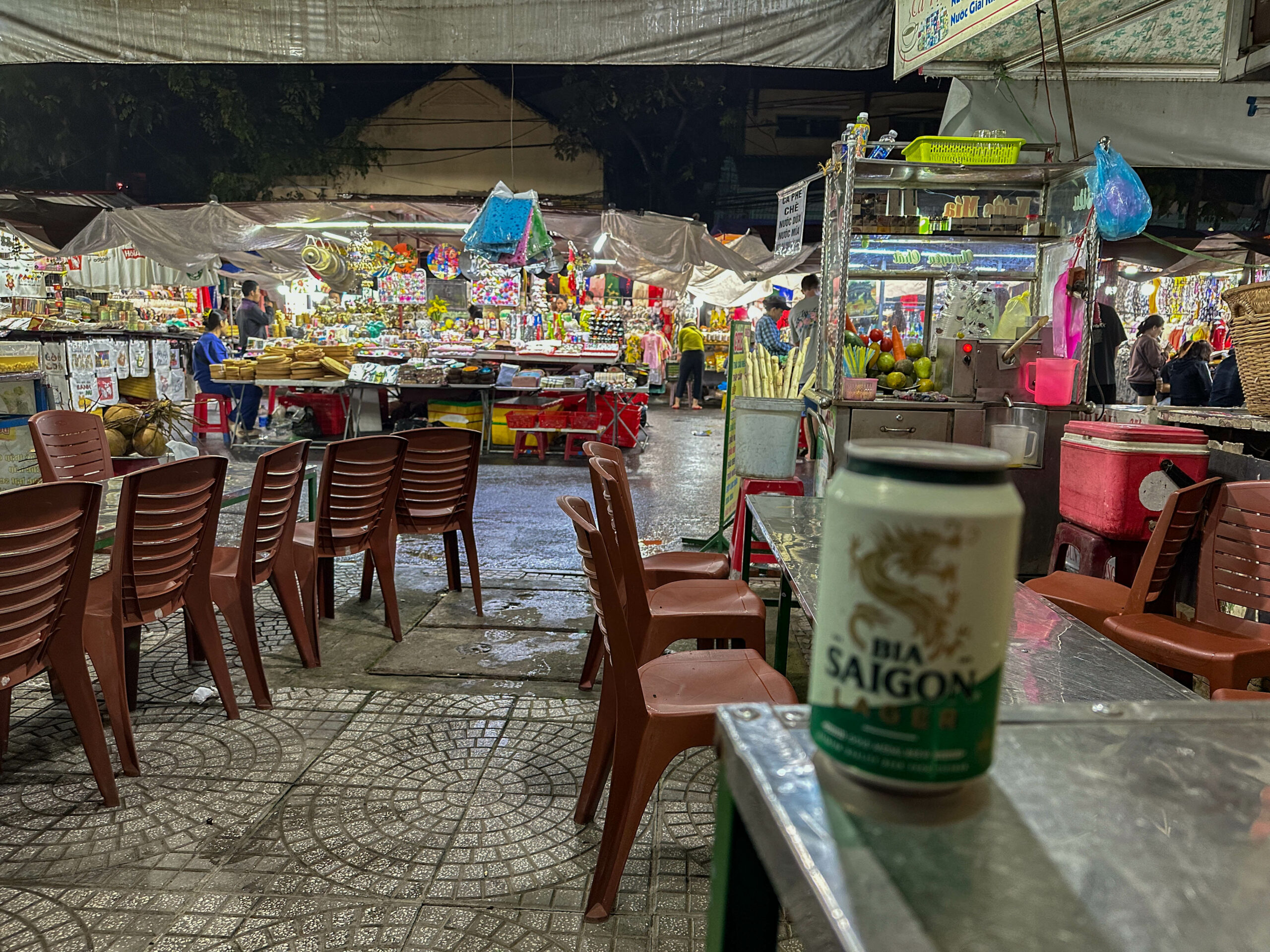 Nun wurde es auch schon wieder finster (gegen circa 17:00 Uhr) und ich beschloss noch, mir etwas warmes zu Essen zu suchen. Ich spazierte vorbei an dem Ben Tre Night Market der direkt am Ben Tre River liegt und sich damit quasi vor der Haustür meines Hotels befindet. Die Verkaufsstände dort verkaufen vorwiegend Obst, Gemüse und irgendwelchen Ramsch.